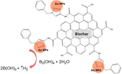 Biochar modified with triazole groups was used as a support of gold nanocatalyst for hydrogen evolution, leading to excellent results.