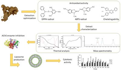 Optimization of the extraction process of bioactive compounds present in ginger (2,2'-azino-bis (3-ethylbenzothiazoline-6-sulfonic acid (ABTS), 2,2-diphenyl-1-picrylhydrazyl (DPPH) and chelating activity of FeII) followed by the characterization of the extraction, evaluation of cytotoxic activity and production of liposomes.