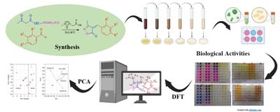 The multicomponent synthesis of isoxazol-5(4H)-ones using an imidazolium-type ionic liquid catalyst provided varying product yields under mild reaction conditions. Through principal component analysis (PCA), a weighted graph was generated representing the descriptors that influence the antimicrobial activity of the derivatives.