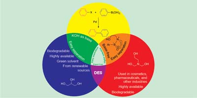 Glycerol-triethanolamine deep eutectic solvent allows the cross-coupling reaction to proceed under inorganic base-free conditions. Triethanolamine phenylboronates were formed in situ and cross-coupling products can be easily extracted with hexane.