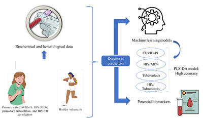 The machine learning model discriminant analysis by partial least squares (PLS-DA) was capable of predicting the diagnosis of coronavirus disease (COVID-19), human immunodeficiency virus/acquired immunodeficiency syndrome (HIV/AIDS), tuberculosis (TB), and HIV/TB co-infection patients with high accuracy and identifying potential biomarkers associated with the diagnosis.