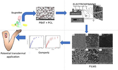 Microfibers of poly(butylene-adipate-co-terephthalate) (PBAT) and poly-(ε-caprolactone) (PCL) containing ibuprofen were obtained by electrospinning technique. The material revealed potential for transdermal application.