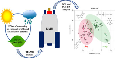 Unlocking seasonal fluctuations in the chemical profile of Eugenia punicifolia through 1H nuclear magnetic resonance and multivariate analysis. Dimethyl sulfoxide (DMSO) leaf extracts revealed distinct chemical profiles and antioxidant activities across seasons, providing insights into the defense mechanisms of the plant.