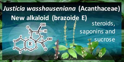 A new alkaloid and other compounds were isolated from Justicia wasshauseniana and characterized by high-resolution electrospray ionization mass spectrometry (HRESIMS) and nuclear magnetic resonance (NMR). The stereochemistry was confirmed by circular dichroism (CD) and time-dependent density functional theory (TD-DFT).