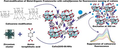 A new fluorescent platform based on calixarene derivative and metal-organic framework (MOF) was synthesized and used as fluorescent probe for cation sensing.