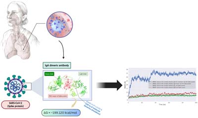 Visualization of the last frame from 100 ns of molecular dynamic simulations between the complex of receptor-binding domain (RBD) protein and neutralization of the dimeric antibody IgA (PDB ID: 6UE7). This antibody class showed the greatest potential for neutralizing spike protein with binding affinity of -199.120 kcal mol-1.