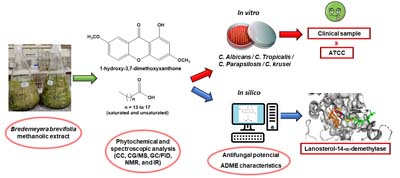 Identification of fatty acids and 1-hydroxy-3,7-dimethoxyxanthone in Bredemeyera brevifolia extracts. Its methanolic extract demonstrated in vitro antifungal potential on clinical samples and American Type Culture Collection (ATCC). The in silico test indicated potential for CYP 51 inhibition, especially for xanthone.