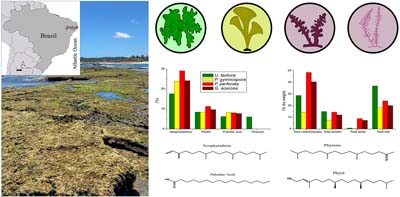 The metabolites of four macroalgae species from sandstone reefs on the Brazilian tropical coast were characterized. Red algae had the highest concentrations of carbohydrates, protein, and lipids and most of the metabolites.