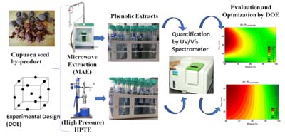 Comparison of the extraction of bioactive compounds from the by-product of cupuaçu seed by microwave-assisted extraction (MAE) and high pressure/temperature extraction (HPTE), using the Box-Behnken 33 factorial design. Both extraction techniques proved viable for polyphenol recovery in cupuaçu seed by-product, with multi-response optimization indicating ideal conditions, achieving a 48% recovery of (‒)-epicatechin.