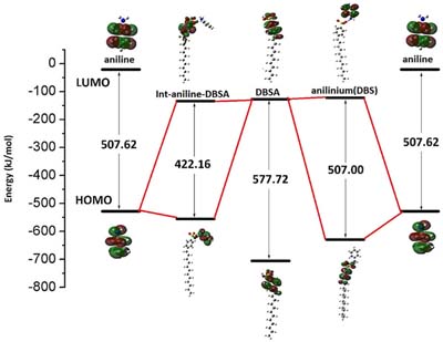 The study analyzes the combination of frontier orbitals of aniline and dodecylbenzene sulfonic acid structures, using the density functional theory (DFT) B3LYP-6/311+G* method, whose result indicates the formation of anilinium-DBS (dodecylbenzene sulfonate) salt.