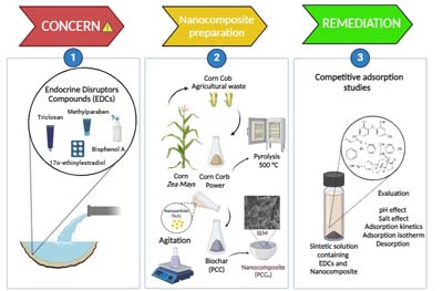 A novel nanocomposite of biochar and maghemite was prepared and characterized to investigate its efficacy in the competitive adsorption of endocrine disruptors from aqueous media.
