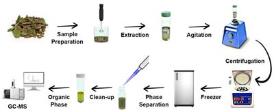Scheme of the solid-liquid extraction with low-temperature partitioning (SLE/LTP) technique for extracting pesticides of green tea leaves and analysis by gas chromatography coupled to mass spectrometry (GC-MS).