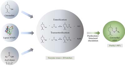 Efficient production of citronellyl esters through esterification and transesterification catalyzed by Novozym®435 via linear acylating agents (C3-C18) with kinetic modelling, product isolation and reuse of the biocatalyst.