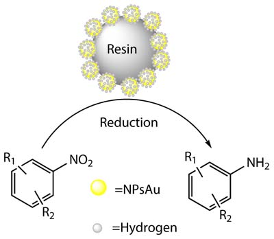 New thio-functionalized resins have the capacity for the confinement of gold nanoparticles and the catalytic reduction of nitro aromatics.