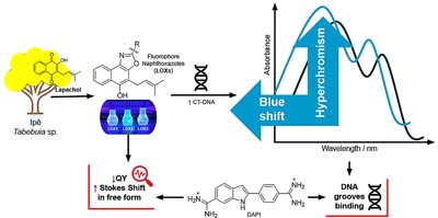 Development of fluorescent deoxyribonucleic acid (DNA) probes derived from lapachol, a naphthoquinone extracted from the yellow ipe tree. Novel fluorophore naphthoxazoles were synthesized, demonstrating the ability to interact with DNA via groove binding. Details are presented in the Article Naphthoxazoles Derived from Lapachol as Fluorescent DNA Probes: Synthesis and Binding Studies with Calf Thymus DNA by Délis G. Guimarães, Victória L. A. Santos, Sidney S. Simplicio, Arlan A. Gonsalves, João J. S. Gouveia, Fernanda B. Almeida, Luiza A. Gusmão, Antonio C. Tedesco, Fernando L. Primo, Larissa A. Rolim and Cleônia R. M. Araújo on e-20240188.