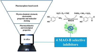 Four potential selective monoamine oxidase B (MAO-B) inhibitors were identified by screening compounds in the chemical space of molecular databases using in silico techniques.