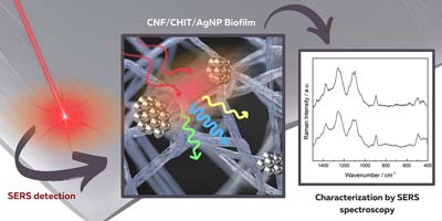 Chemical interactions of chitosan and cellulose-nanofiber/chitosan films with silver nanoparticles investigated through surface-enhanced Raman scattering (SERS) spectroscopy.