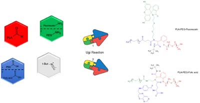 The synthesis of two poly(lactic acid)-b-poly(ethylene glycol) (PLA-b-PEG) block copolymers using the Ugi multicomponent reaction is described. Folic acid and fluorescein frameworks were introduced as targeting and fluorescent marker aiming further application in the controlled release of drugs for cancer therapy.