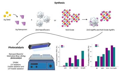 ZnO and Ni-Al-Oxide associated with Ag prismatic nanoplatelets as efficient materials for the photocatalytic degradation of Remazol Black 5 and Methylene Blue.