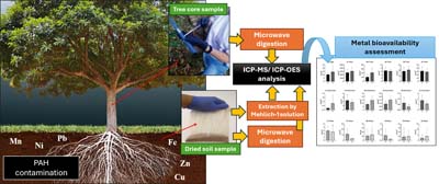 Tree core and paired soil samples were collected, digested in a microwave system and analyzed by inductively coupled plasma mass spectrometry (ICP-MS) for their respective total concentrations of Cu, Fe, Mn, Ni, Pb, and Zn. Additionally, soil samples were treated by the Mehlich-1 solution to assess the labile content of the analytes using inductively coupled plasma optical emission spectrometry (ICP-OES).
