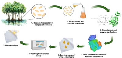 Bacillus subtilis TIM27, isolated from mangrove sediments, produced the BiosT27 biosurfactant and the ProT27 subtilisin, exhibiting protease and esterase activities. When tested together as detergent additives, they demonstrated excellent stain removal performance.