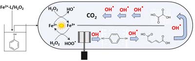 This figure illustrates the phenol degradation process in a Raceway Pond Reactor using the photo-Fenton reaction. Fe²⁺/H₂O₂ generates hydroxyl radicals (HO), which degrade phenol into smaller organic acids and CO₂. Sunlight enhances Fe²⁺ regeneration, sustaining radical production. The system ensures continuous degradation through radical propagation and oxidation pathways.
