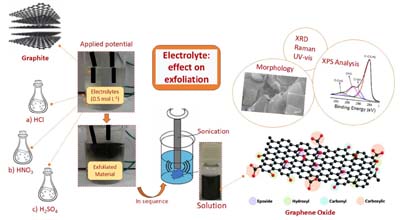 Steps of graphene oxide (GO)/reduced graphene oxide (rGO) synthesis by electrochemical exfoliation of graphite from discharged batteries due to the use of acidic electrolytes.