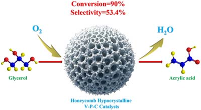 A highly efficient hypocrystalline V-P-C catalyst with a porous honeycomb structure is utilized for the continuous production of acrylic acid through glycerol dehydration.