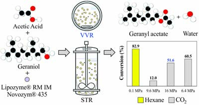 Geranyl acetate was synthesized using acetic acid, in the presence of enzymes and using different solvents and reactor types.