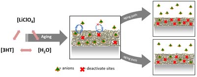 The correlation between the concentrations of the precursors used in the polymer synthesis that will be aged considerably affects the aging path that this sample will undergo. The electrochemical aging of the polymer is caused by the deactivation of parts of the polymer chain that are no longer able to intercalate ions and undergo oxidation/reduction.