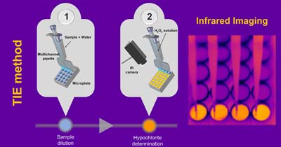 Hypochlorite in bleaching solutions was determined based on the temperature rise from the reaction with a hydrogen peroxide solution. Infrared thermal imaging was used for simultaneous contactless temperature measurements of multiple reactions in a microplate.