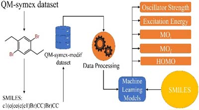 Molecules from the QM-symex database are converted to SMILES (simplified molecular input line entry system) and stored in a new QM-symex-modif dataset with their target properties. The data is processed and used in machine learning models to develop predictive models for photophysical properties.