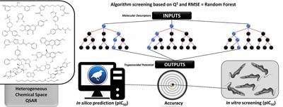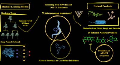Machine learning models were used to predict the biological activity of natural products against Schistosoma mansoni. Virtual screening identified 14 promising compounds, which were further analyzed for absorption, distribution, metabolism, excretion and toxicity (ADMET) properties.