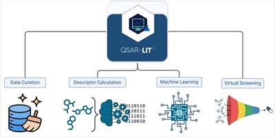 The figure illustrates the core components of quantitative structure-activity relationship (QSAR)-Lit, a platform designed to streamline the QSAR modeling process. It encompasses data curation, descriptor calculation, machine learning, and virtual screening, enabling seamless and efficient analysis for drug discovery applications.